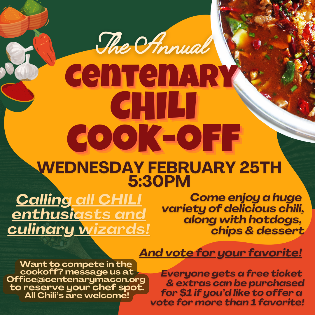 Join us for one of our favorite annual events! Come, to taste and vote for your favorites. Chili entries will compete for the highly coveted awards and bragging rights for the coming year. For more information, contact office@centenarymacon.org.