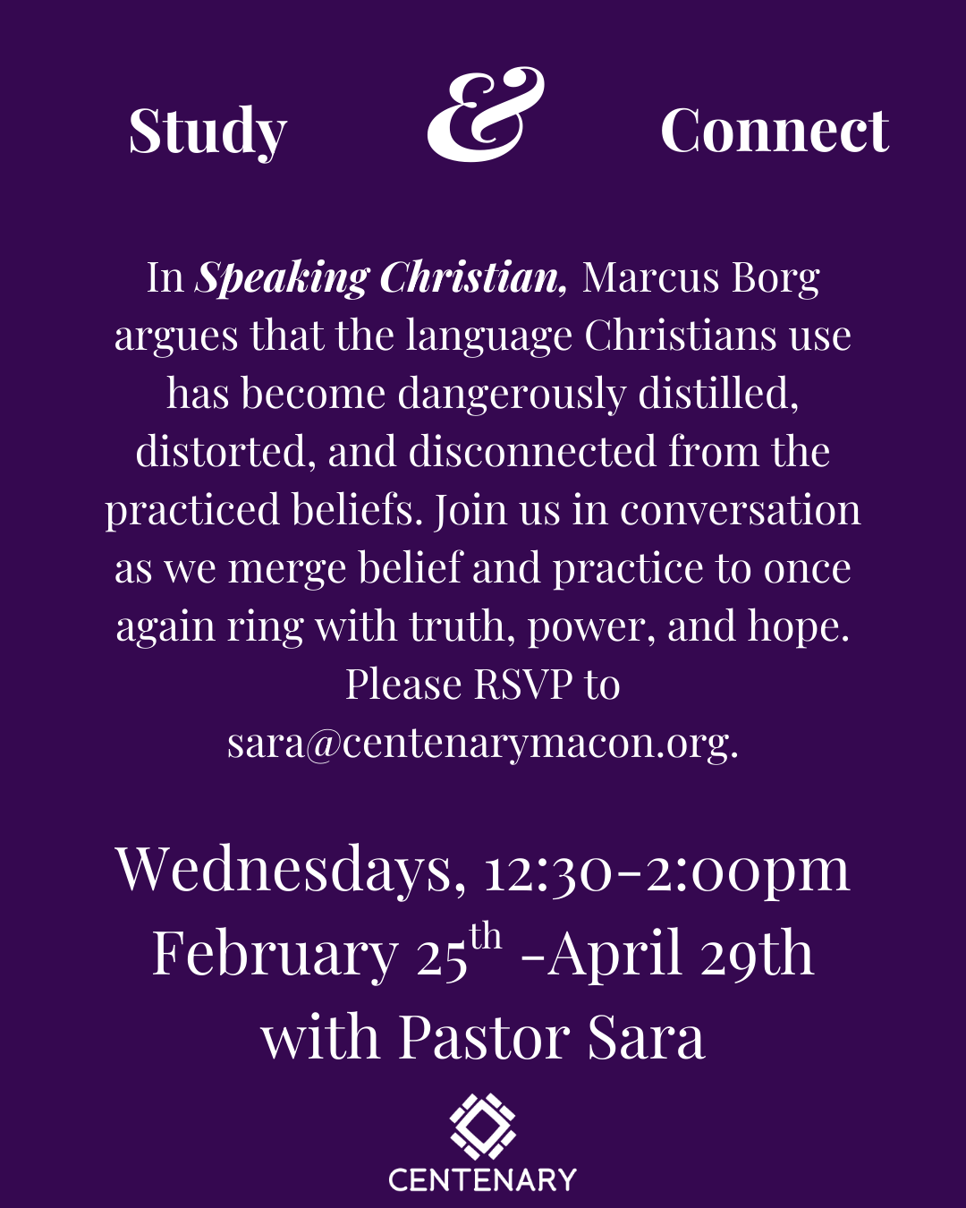 Pastor Sara will be leading a new book study on Speaking Christian by Marcus Borg beginning Wednesday February 25th through April 29th. RSVP to sara@centenarymacon.org.