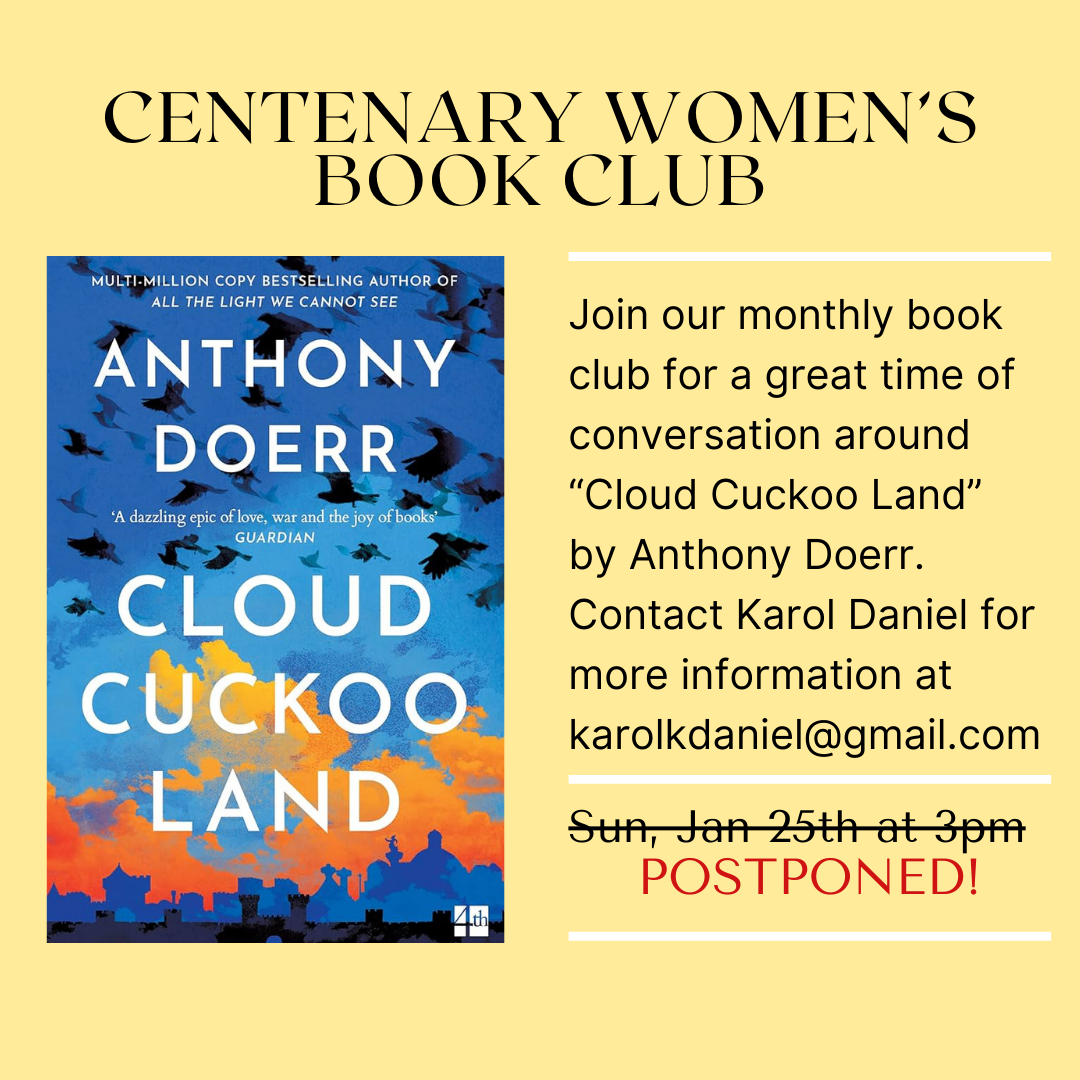 Due to the possibility of inclement weather, the book group gathering for January has now been POSTPONED until next month. For more information contact karolkdaniel@gmail.com.