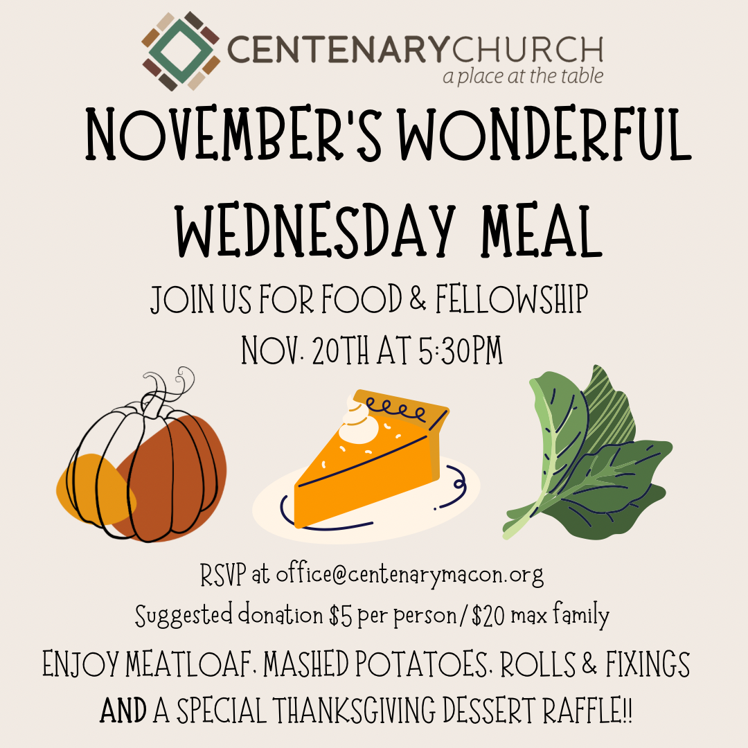 Wonderful Wednesday Wednesday, November 20, 2024 5:30 PM 7:00 PM Google Calendar ICS It’s always a Wonderful Wednesday when we come together to share conversation and a special Thanksgiving meal with friends around the table. Please RSVP by Nov. 15 to office@centenarymacon.org. Suggested donation $5/person, Max $20/family